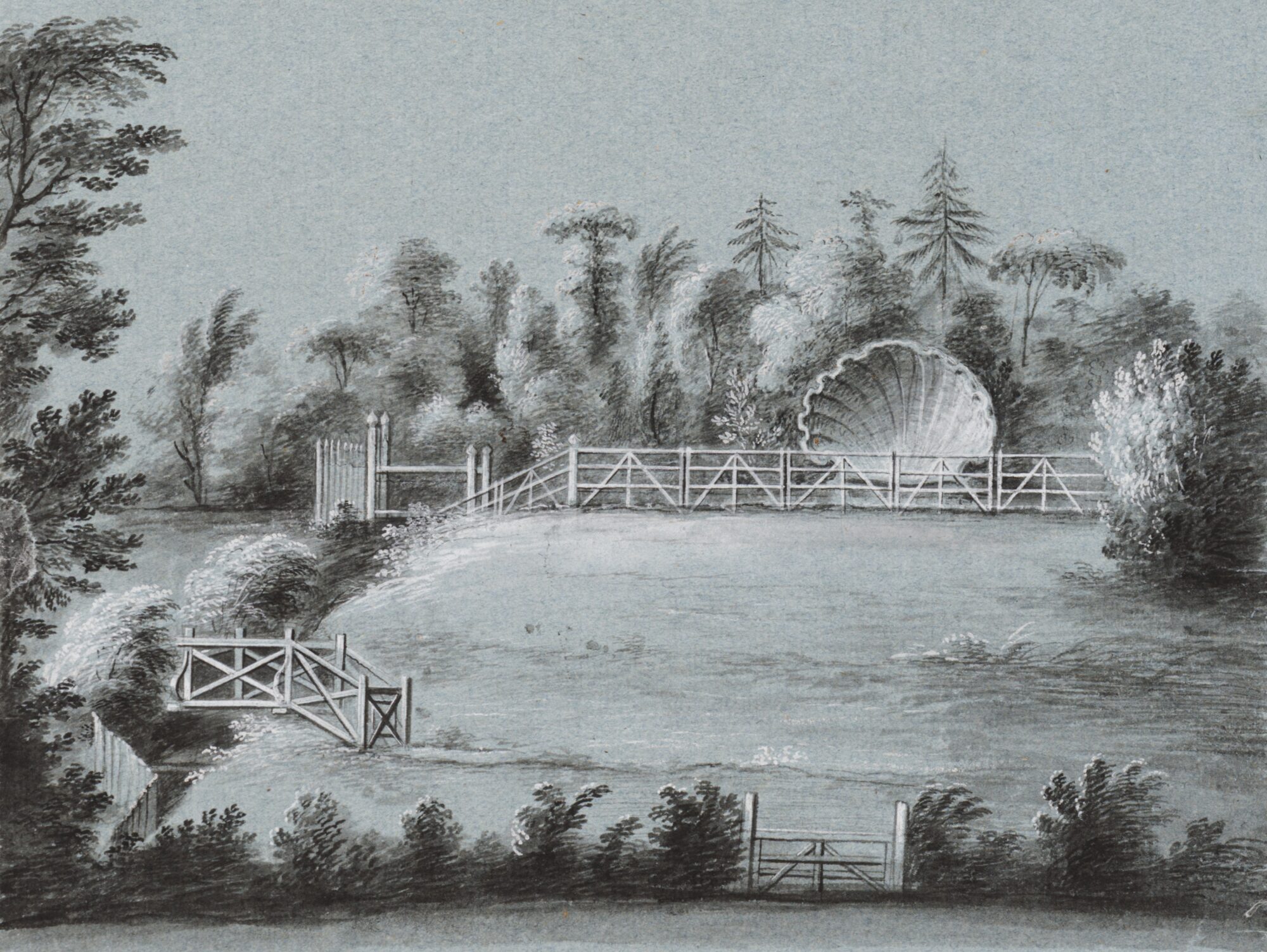 Jean-Henri Müntz, View of the Shell Seat and Bridge at Strawberry Hill, 1755. Ink drawing. Lewis Walpole Library, Yale University.